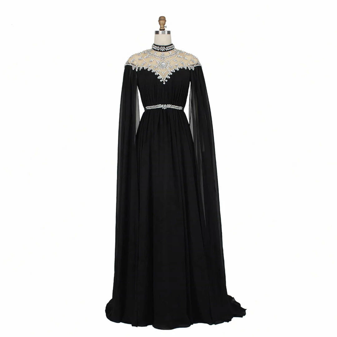 This beautiful evening gown dress is a perfect fit for any formal event. This stunning maxi black chiffon dress features an alluring neckline with a crystal beaded design, and a v-back cut. This gown is sure to captivate your guests at any event.