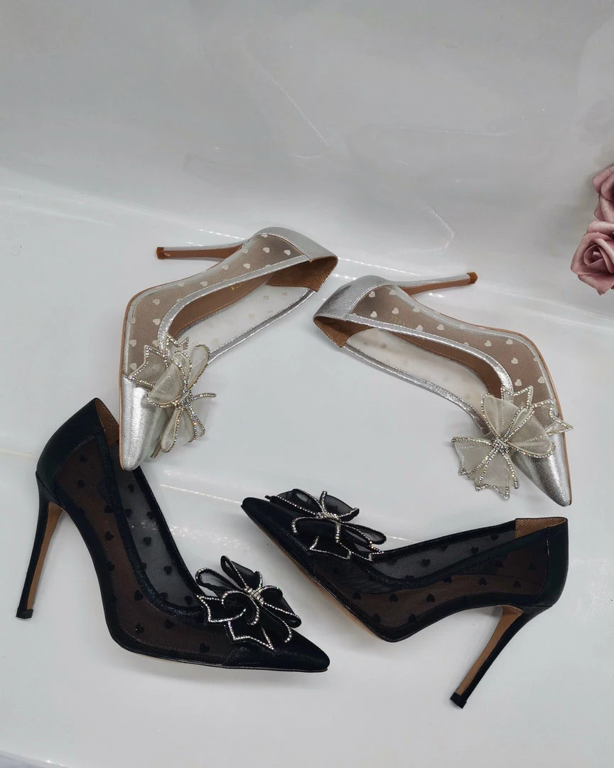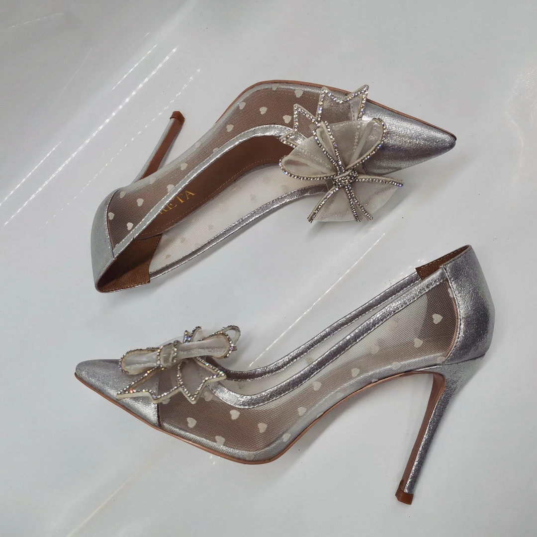 Silver heels, with stunning mesh polka dot side design, featuring large mesh bows with crystal edging. Each shoe has been handcrafted to the highest quality.