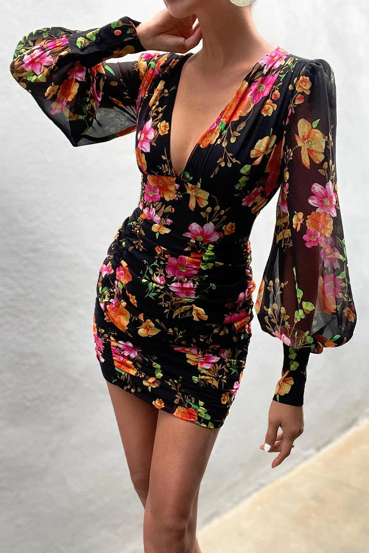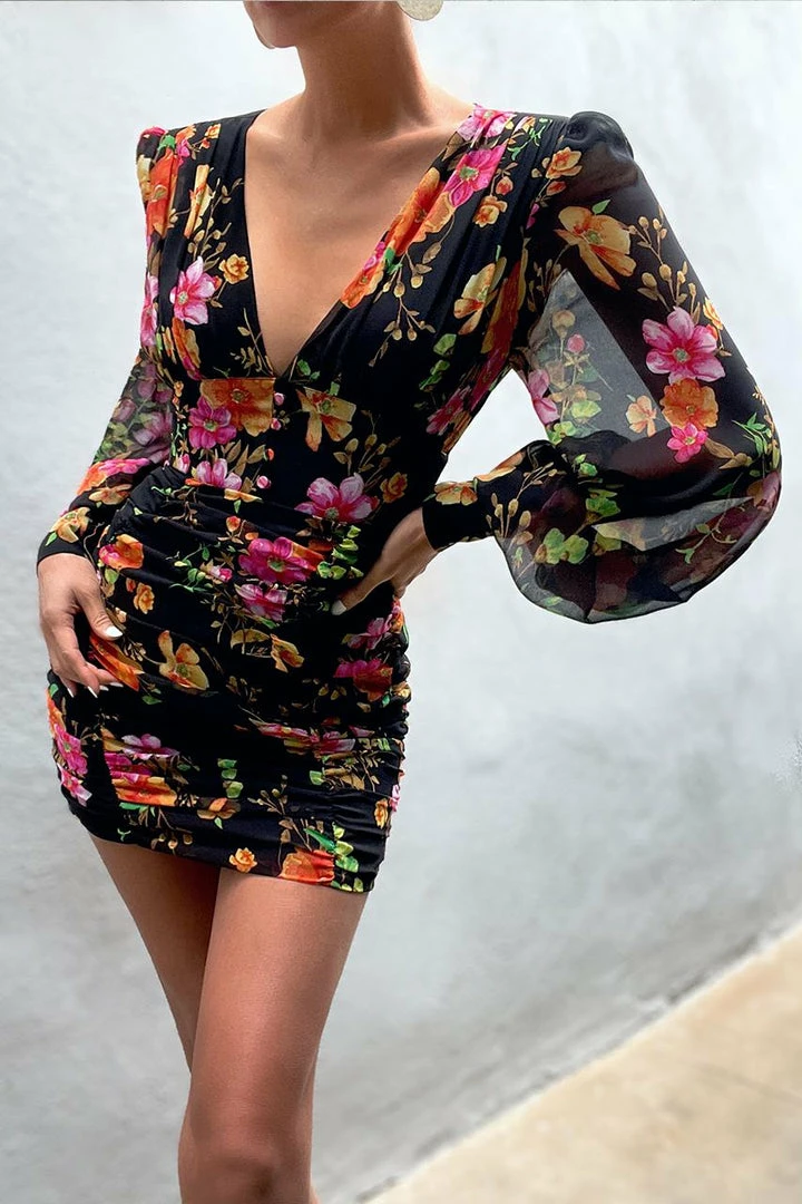 Our black floral dress Dress features a V-neckline, long puff sleeves with buttons on the cuffs, centre-front button detailing on the waistband, a centre-back invisible zipper, ruching, lining and no stretch. Brand: Runaway