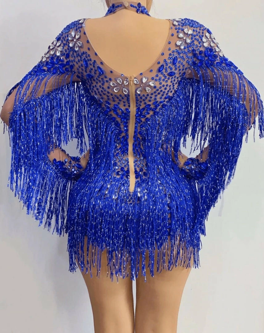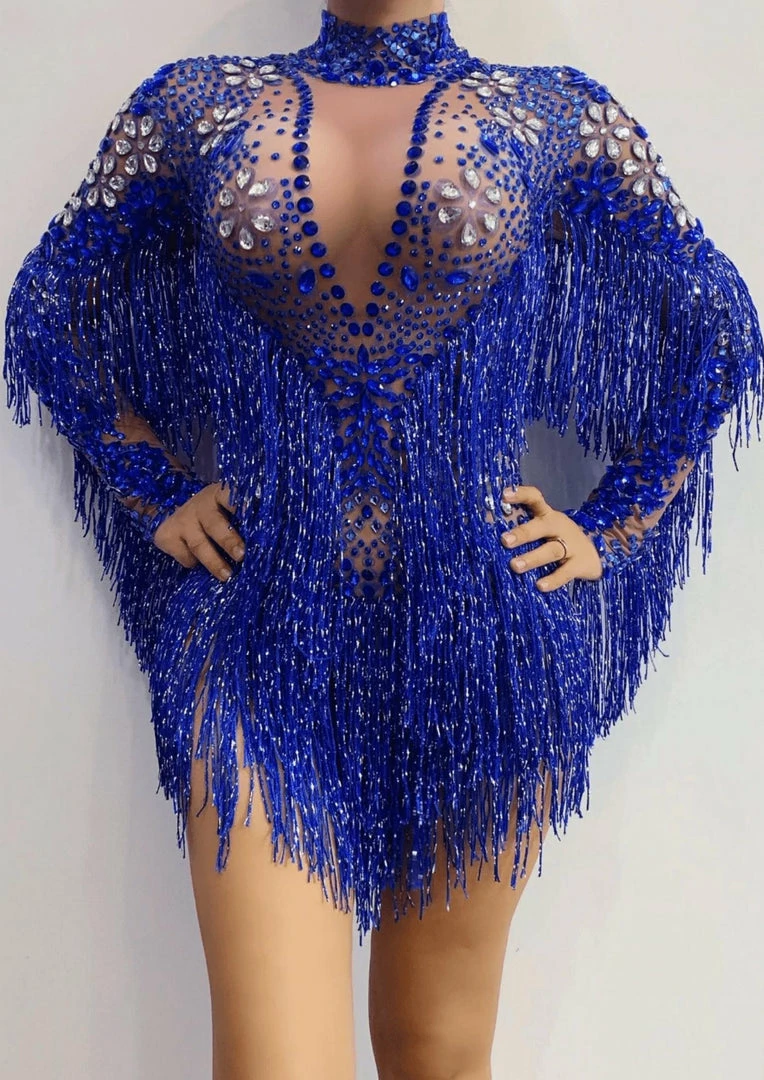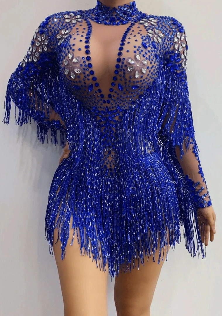 Make a statement on your special night out with this blue sheer mesh party evening dress! Embellished with crystal rhinestones, this dress is all about the glitz and glamour. It will definitely make you shine on your special day. The nude sheer mesh adds sexiness to the piece.