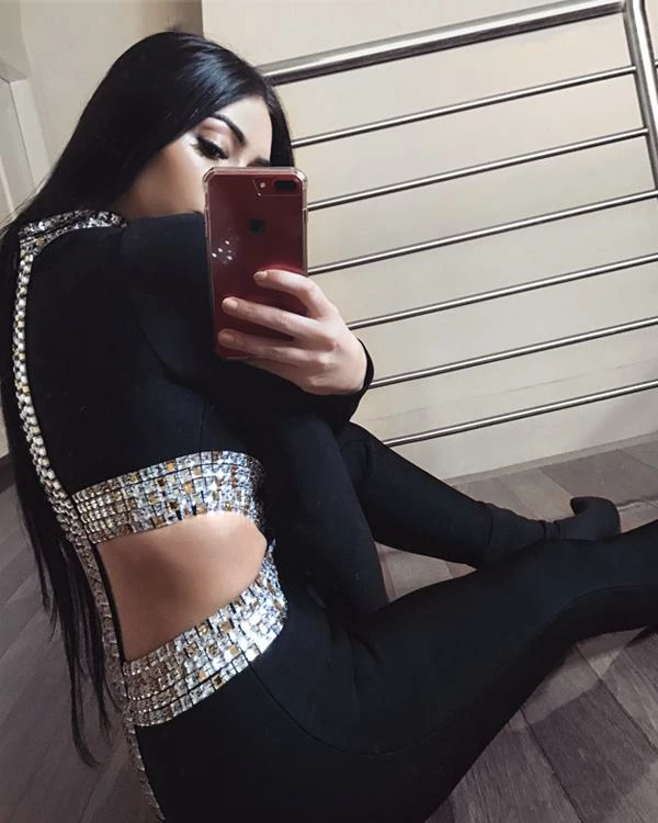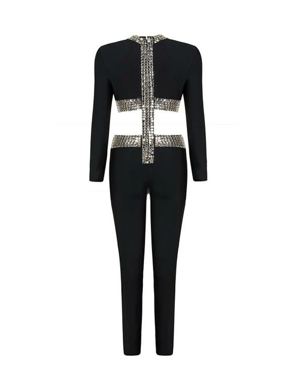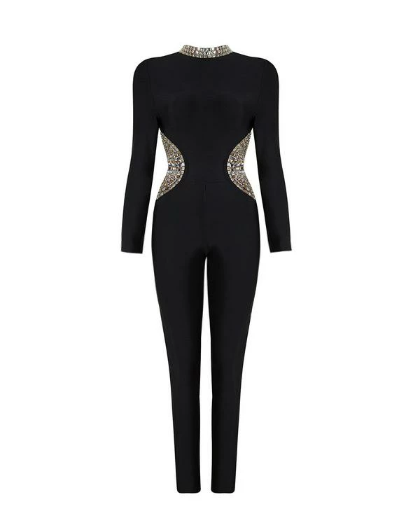 A stunning long sleeve jumpsuit that will turn heads wherever you go, this is a beautiful wardrobe piece made to suit any occasion. It features a high crew neckline, wide open cutouts at the waist and gorgeous crystal embellishments throughout the bodice for a sexy glamorous look you’ll love.