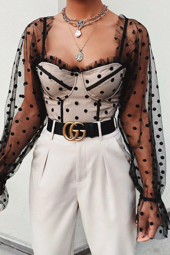 Do as the Parisians do. Add a hint of chic to your wardrobe with our Coco Top. It features a cropped cut, polka-dot mesh overlay with lining underneath, long sleeves with elasticated cuffs, slight frills along the sweetheart neckline, a sewn in bra wire, a centre-back exposed metal zipper and no stretch. Brand: Runaway
