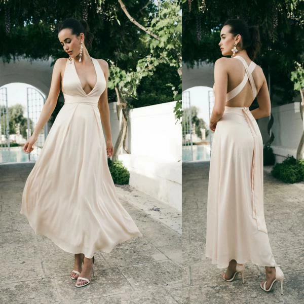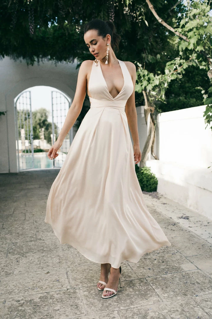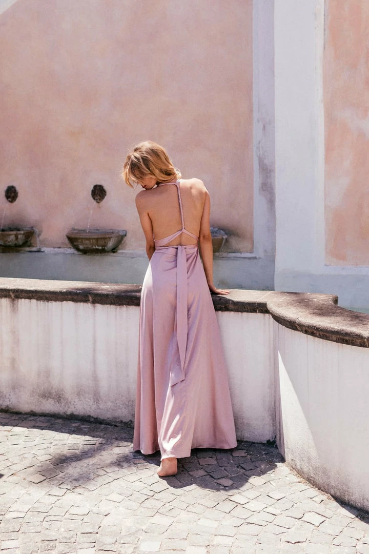 Multi way maxi dress available in Blush & Champagne colour. Made from premium satin fabric. This maxi dress can be tied multiple ways to create different looks.
