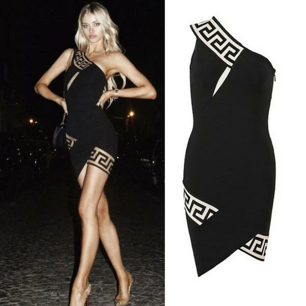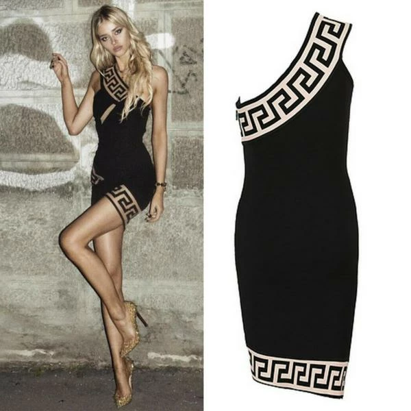 A sophisticated bandage dress with a fun modern style, this one shoulder dress has criss cross bands that hug the body and a fun Greek key trim across the neckline and hem. The added tulip hemline gives your body an ultra curvy look.