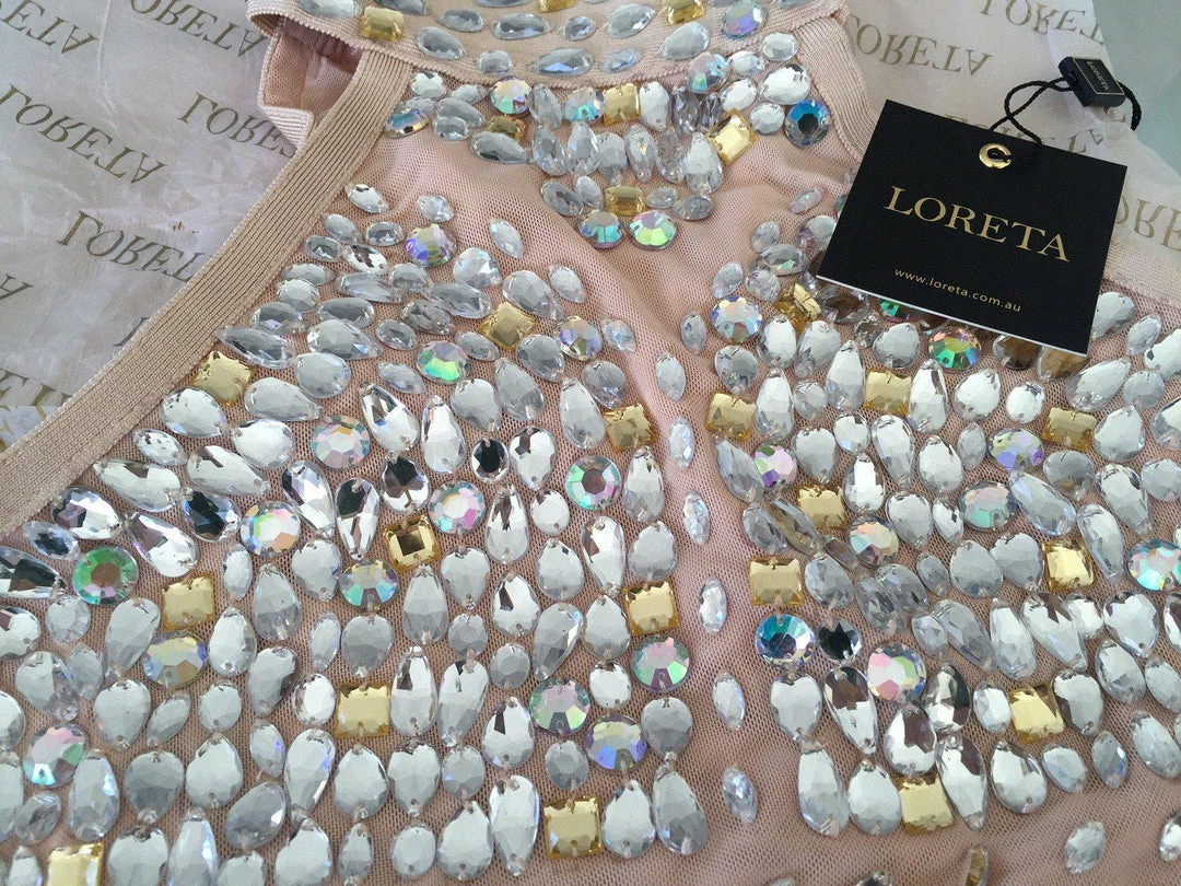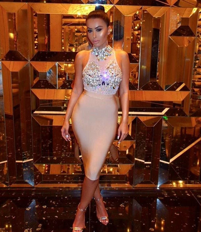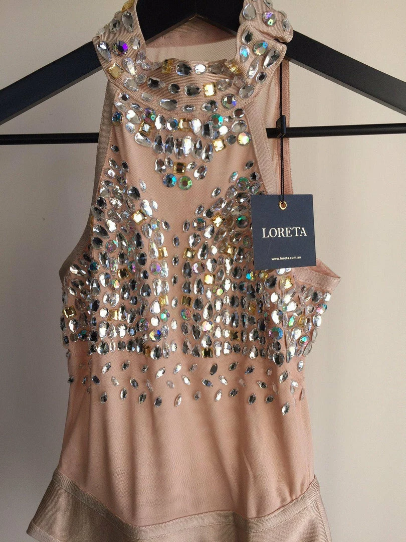 Mesh bodysuit, crystal bust, sprinkled with hundreds of crystals.