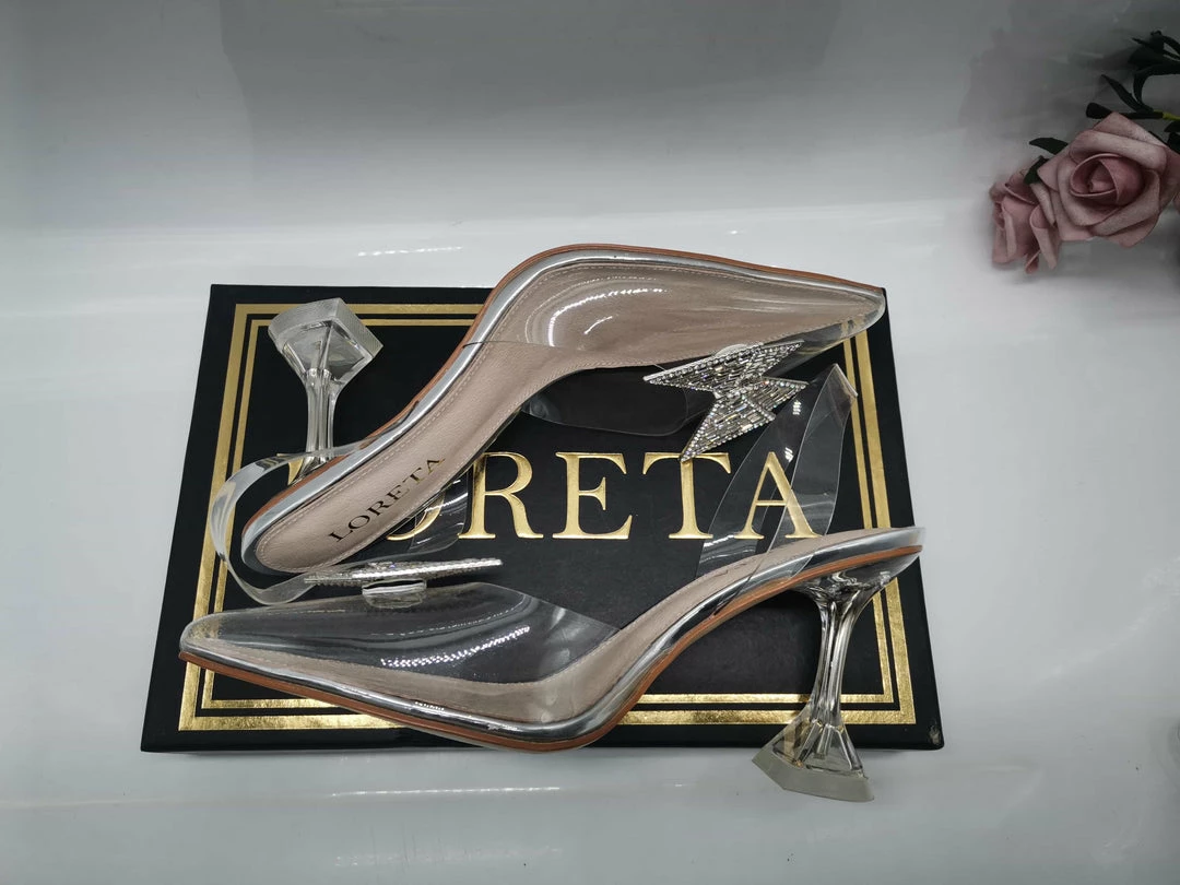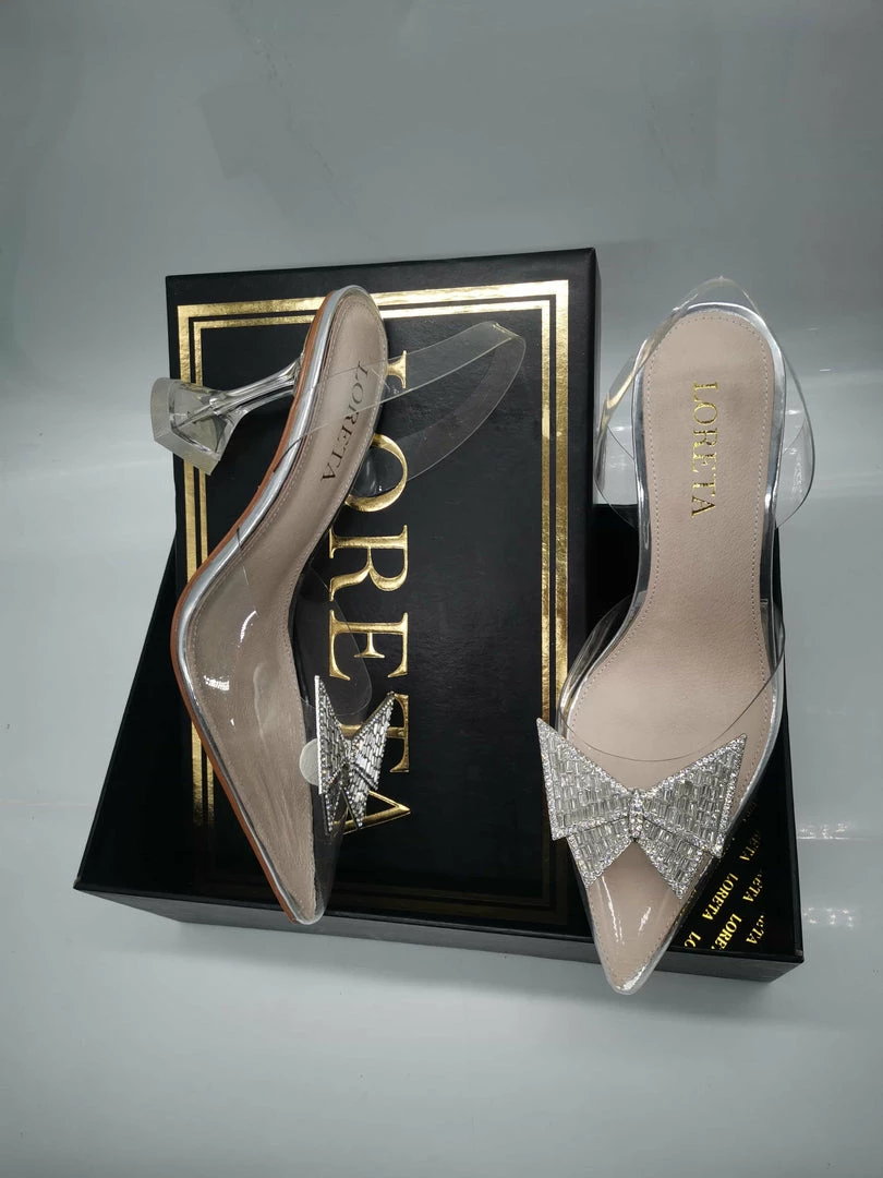 Get ready to turn heads in this elegant pair of clear platform heels. The crystal encrusted butterfly accents the sturdy clear perspex that makes these shoes extra special, while the sheepskin leather lining keeps your feet comfortable as you walk around all day. With a 9cm heel, these heels are perfect for any occasion where you want to make an impression.