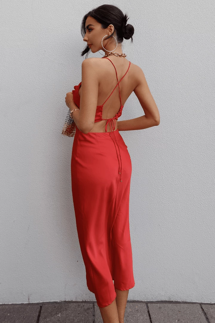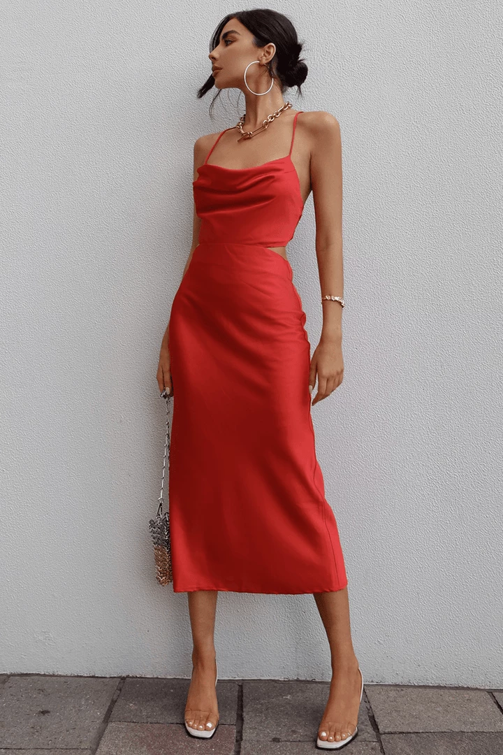 Our Doli Slip Dress features a midi length, cowl neckline, halterneck detailing with adjustable ties at the midsection of your back, invisible zipper, stretch and no lining.