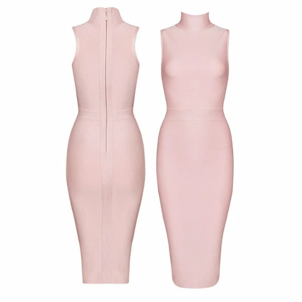 The Elena Dress is a beautiful must-have that seamlessly takes you from work to a night out on the town. It features a high collar, sleeveless style with cinched waist and form-fitting bandage fabric that show off your gorgeous figure.