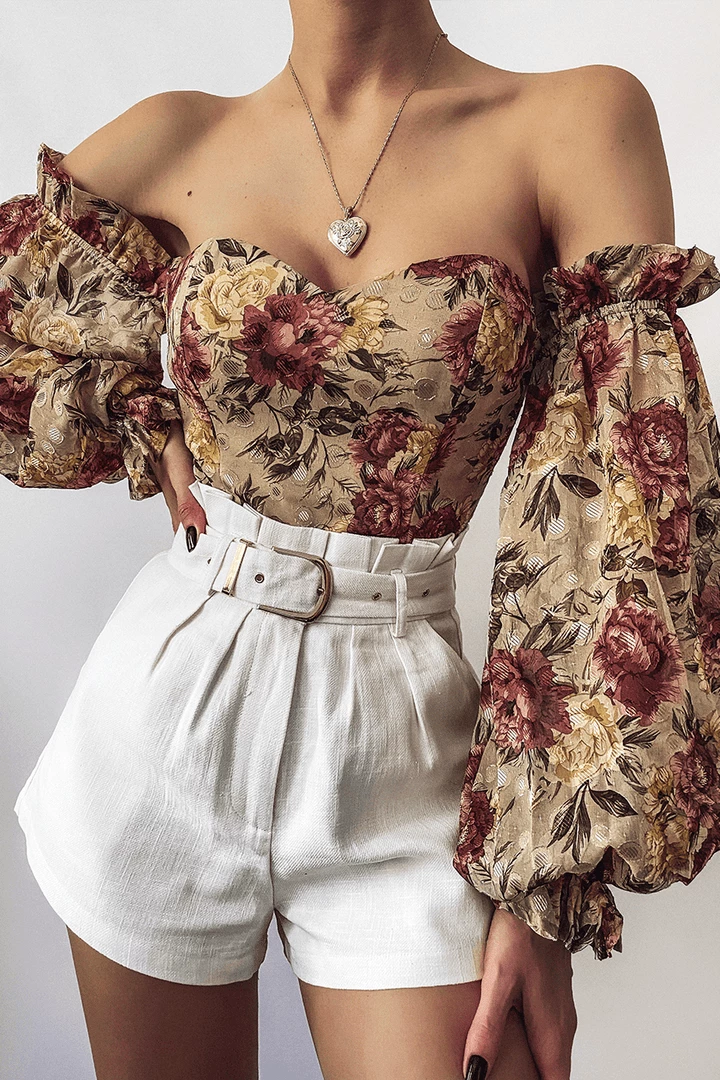 Put some spring in your step. Our Ella Bodysuit features off-the-shoulder long sleeves, a sweetheart neckline, elasticated cuffs, lining, shirring in the back bodice and the bottom half is made of a stretchy jersey.