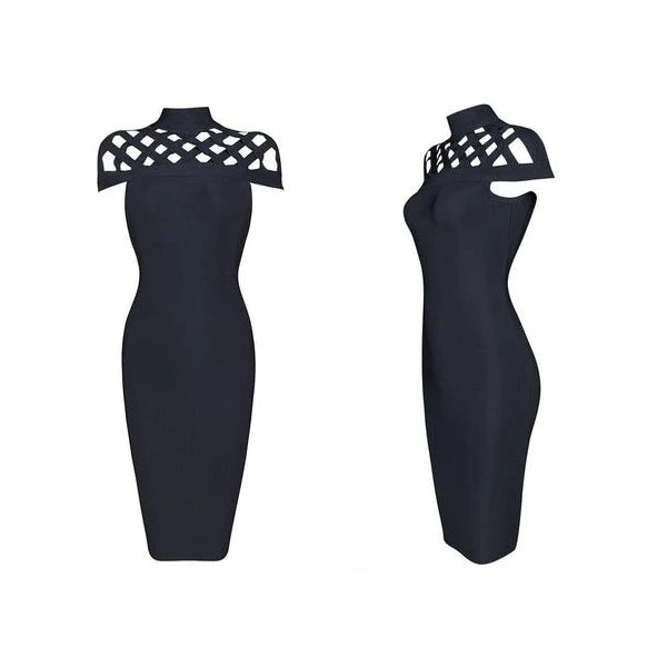 Add a sultry touch with this beautiful bandage dress. The slim sleek body hugs curves and the cross hatch ribbon detail at the neckline give a sexy peek up top.