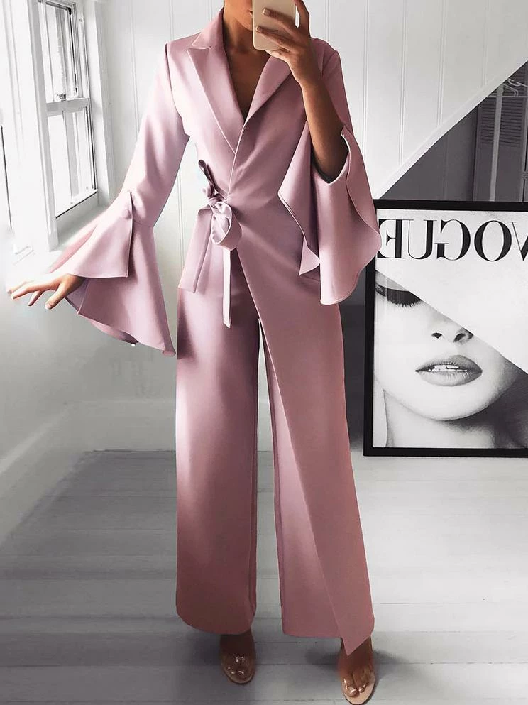 A trendy jumpsuit that’s totally on point, this fun playful look is perfect day or night. The wide notched collar paired with wide ruffle bell sleeves are an ideal balance of tailoring and romance. The side tie and asymmetrical overlay give the outfit a long sleek look.