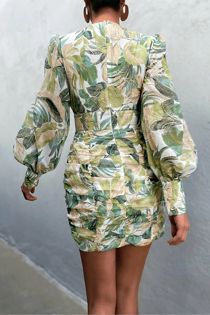 Our Paradise Dress features a V-neckline, long puff sleeves with buttons on the cuffs, centre-front button detailing on the waistband, a centre-back invisible zipper, ruching, lining and no stretch. Brand: Runaway
