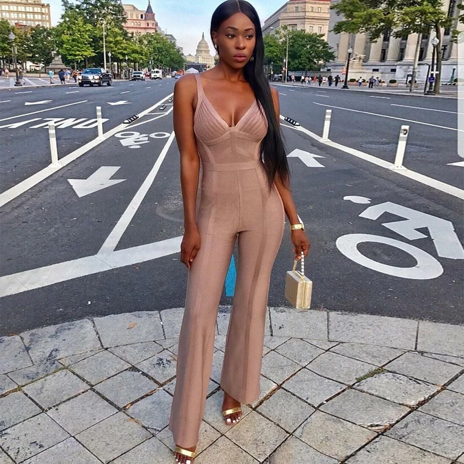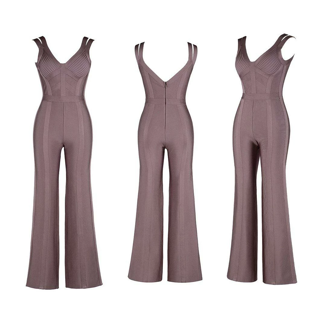 A bandage jumpsuit that makes a bold statement, this is a sexy daring style that perfectly show off those gorgeous curves. The wide plunge neckline paired with a tone on tone trim contrasts the slightly flared bottom for a beautiful hourglass look.
