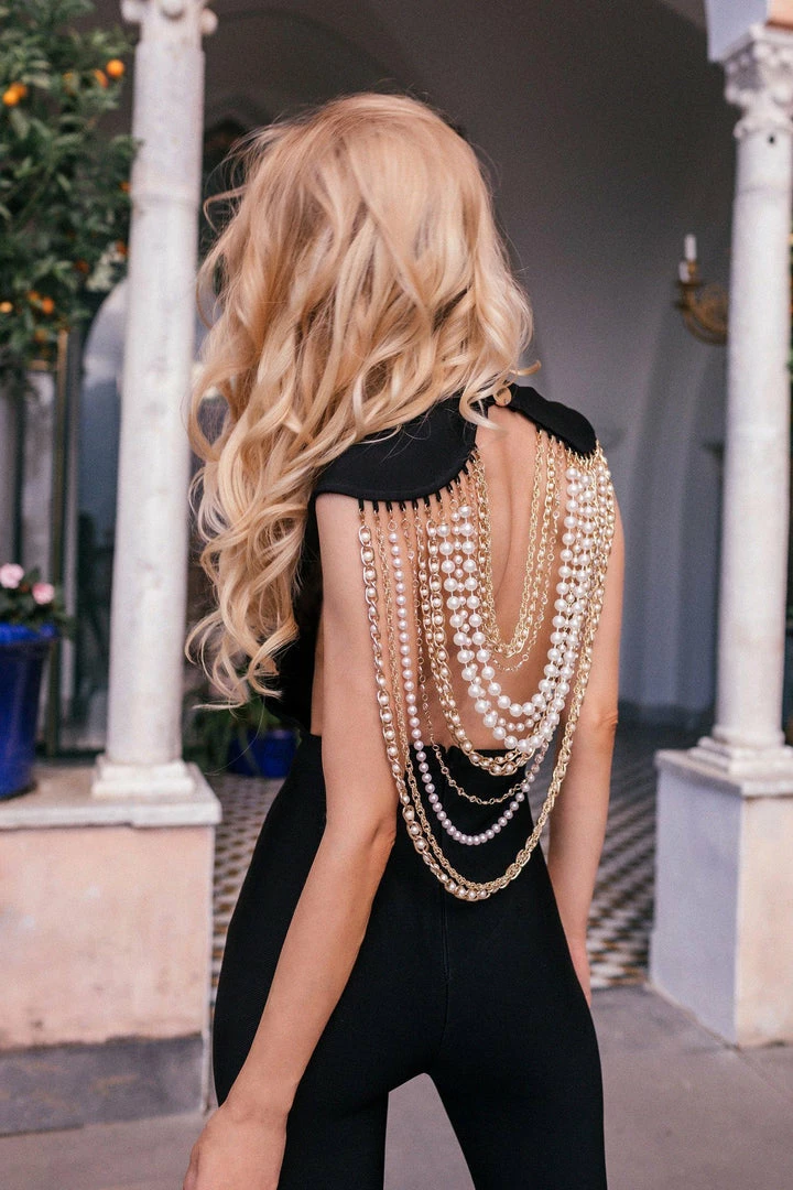 Perfectly designed for a bold impact, the Lola jumpsuit is a chic sultry style that looks incredible from front to back. The solid form-fitting look perfectly highlights the gorgeous cascade of chains and pearls down the full length of the back.