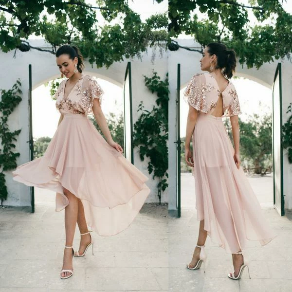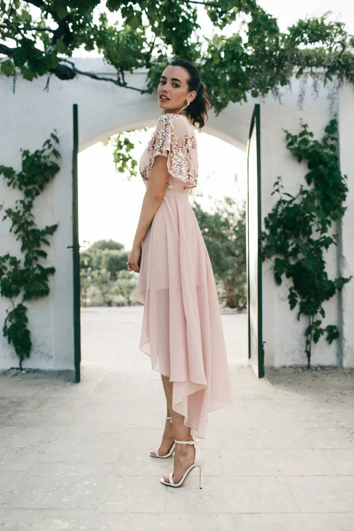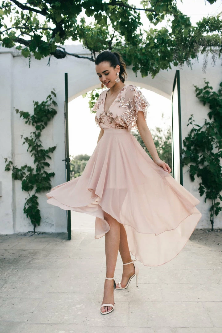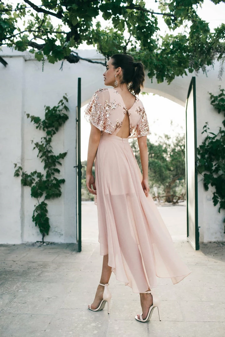An enchanting dress to make you feel like a princess, the Magic Dress is a gorgeous combination of soft chiffon and striking sequined detail along the bodice. The low v-neck highlight the bust, long hi-lo hem and sheer butterfly sleeve complete this romantic look.