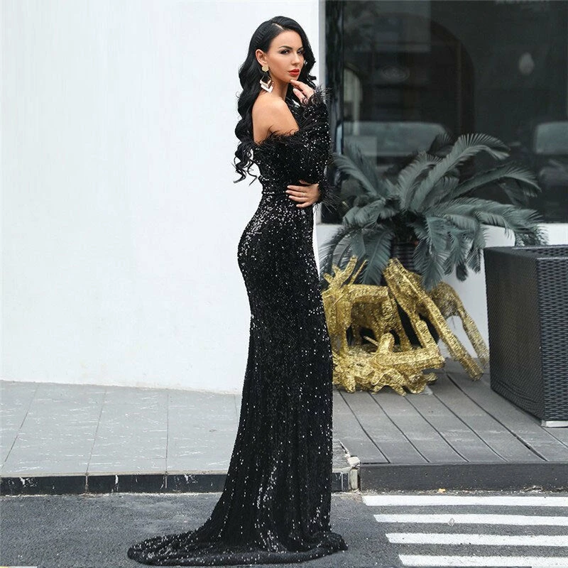 Sexy Off Shoulder Feather Long Sleeve Sequin Party Dress