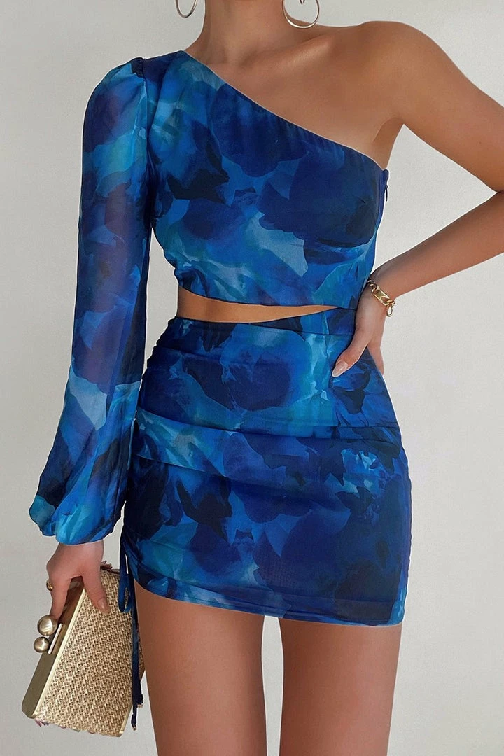 Our Moscato Mini Dress features a mini length, an asymmetrical neckline with one long sleeve, elasticated handcuffs, a cut-out in the midsection, an adjustable drawstring on one side from the hemline, an invisible side seam zipper, no stretch and lining. Brand: Runaway
