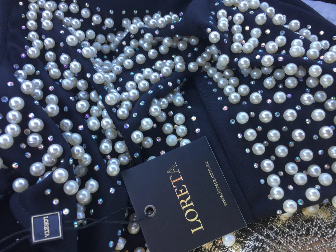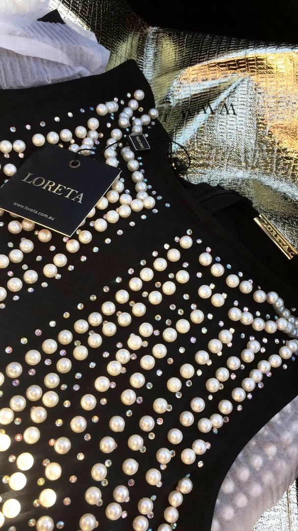 Pearl Jumpsuit with crystals & rhinestones. Each individual jumpsuit has hundreds of hand sewn pearls to it. Available in black, & cream.