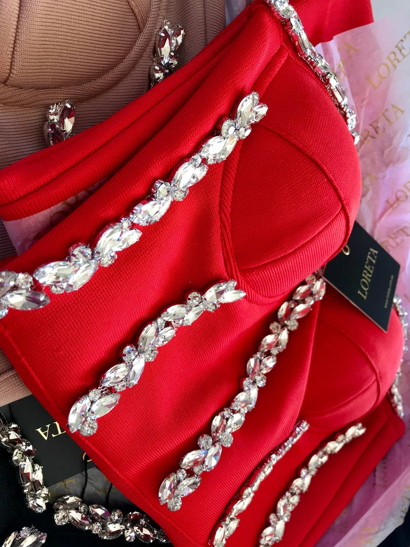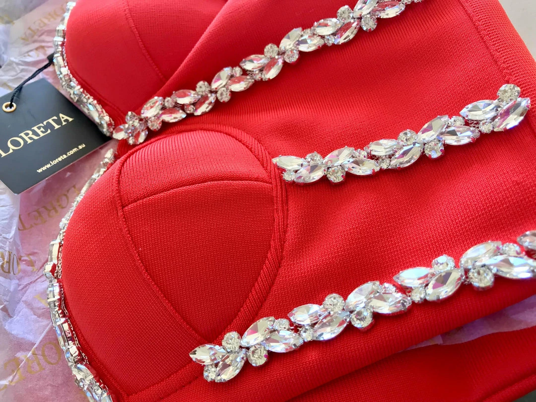 Let your style do the talking with this Persian Dress in Red. The strapless top is embellished with lustrous stones, highlighting your best assets. And the dress is made of premium bandage fabric designed to smooth, tone and flatter your body. Simply pair it with a statement necklace, nude heels and a matching purse—and you’re off to wow people!