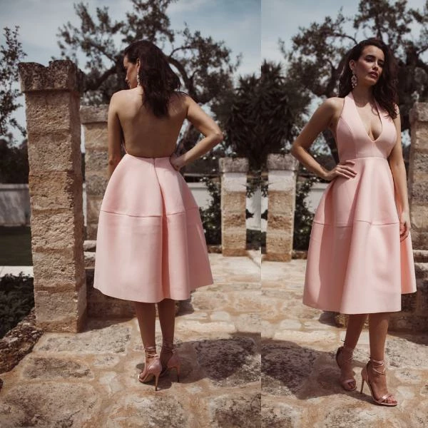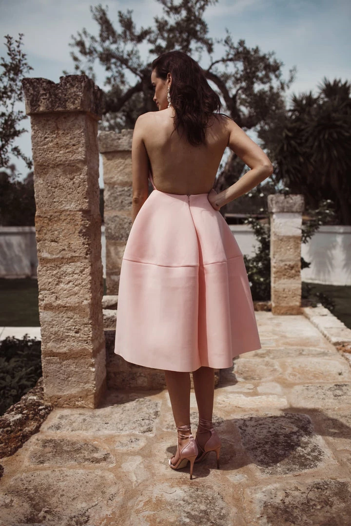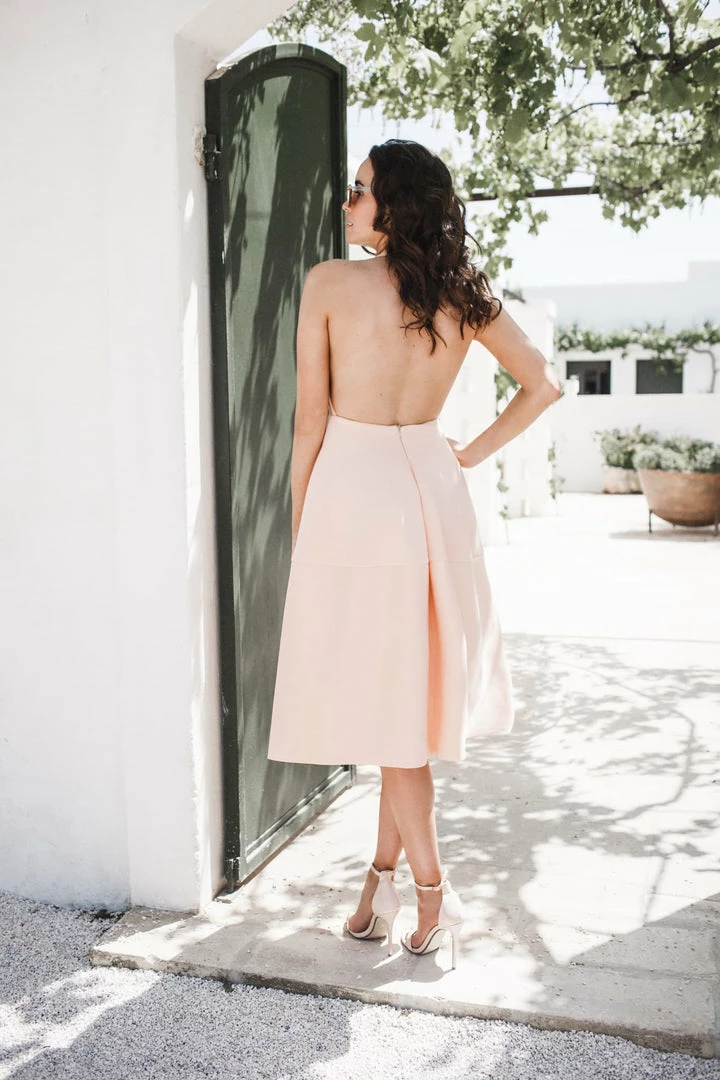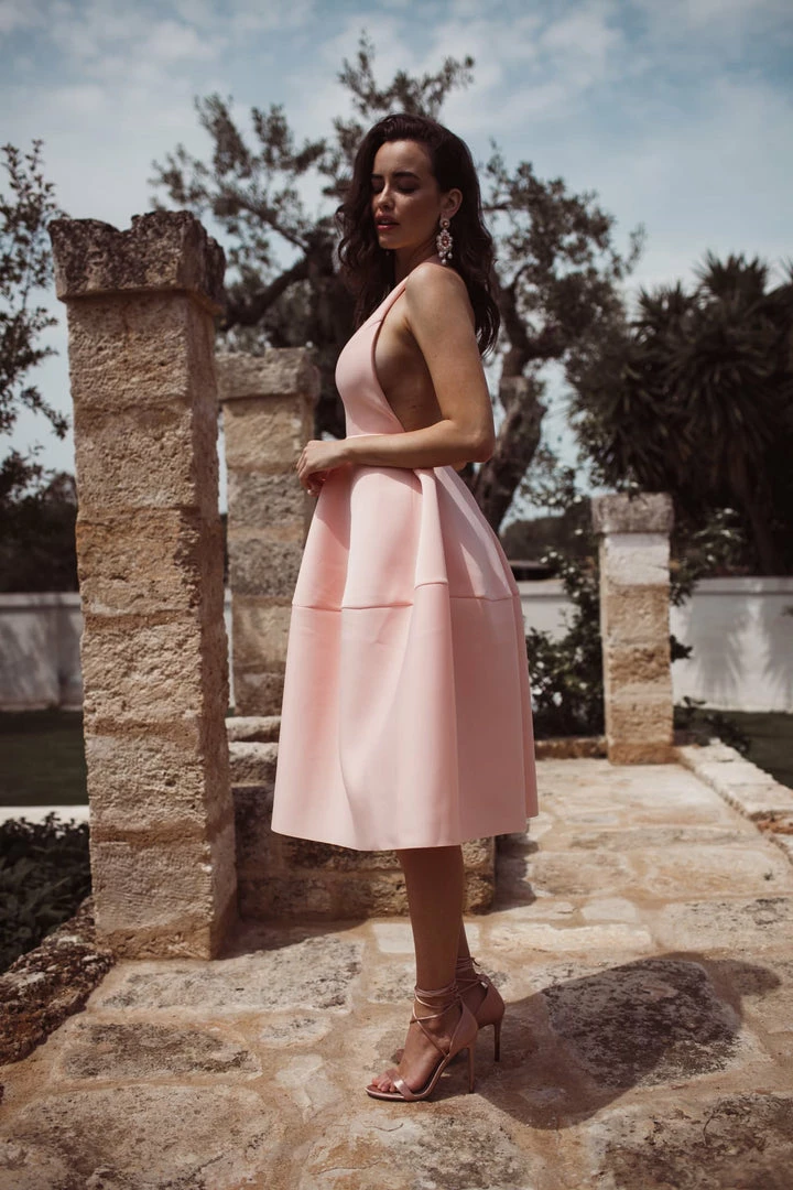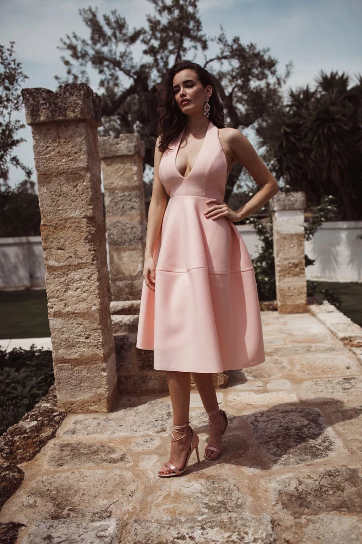 It’s’s made of a beautiful mid-weight scuba material with a soft touch finish. The plunge neckline gives it a sexy edge and the soft pleating in the skirt makes it extremely flattering on. The dress features an open back. This dress would be perfect to wear to an engagement party, a wedding or to win fashions on the field at the races.
