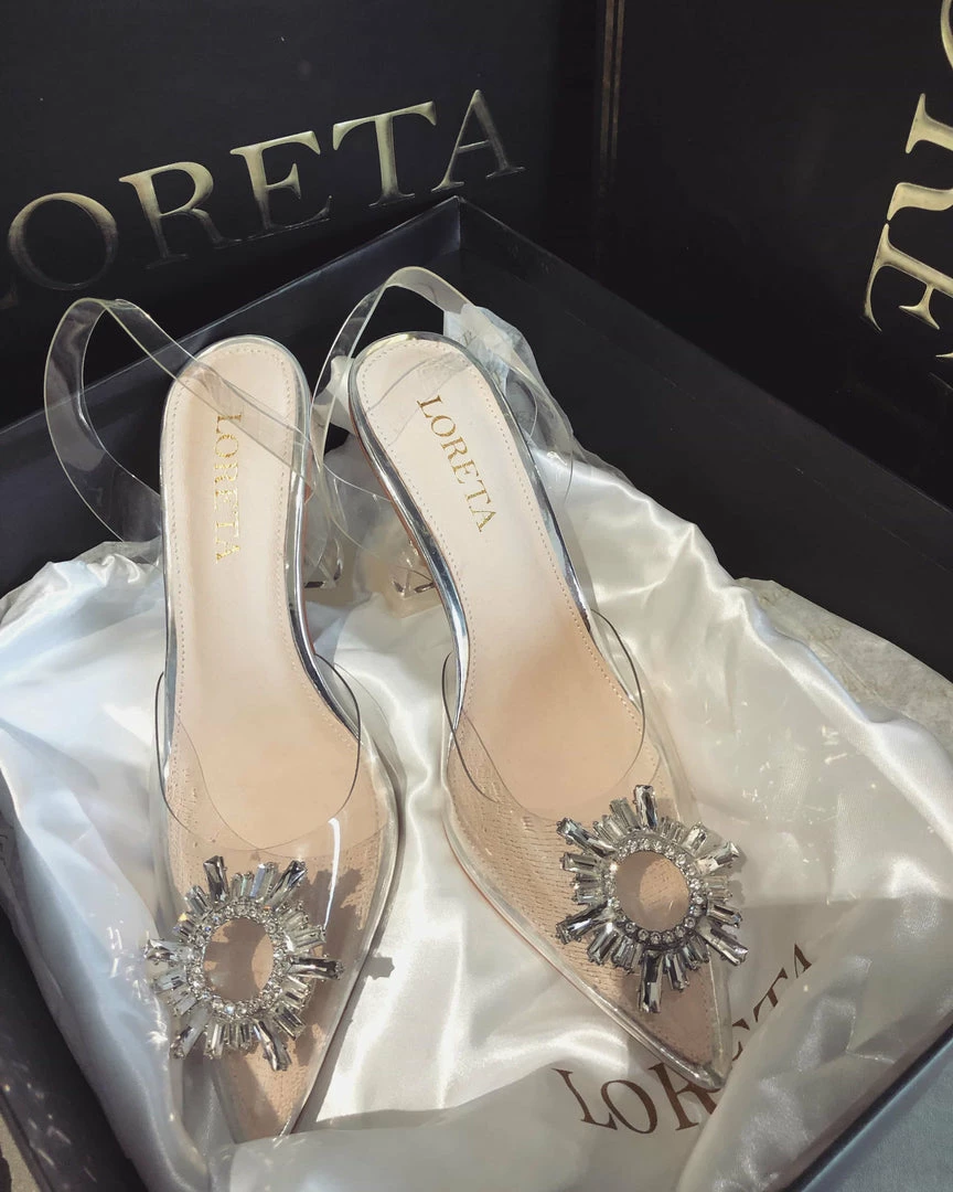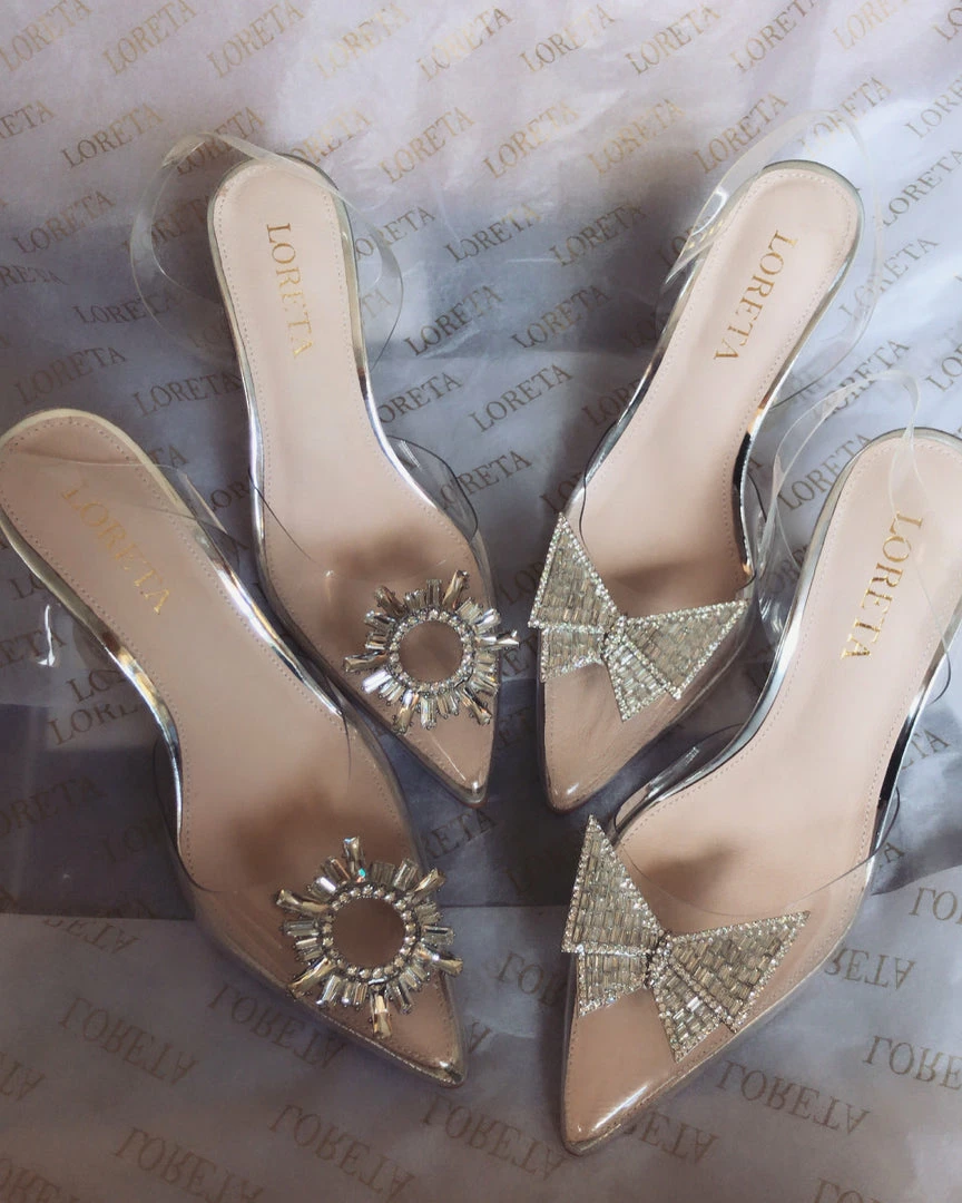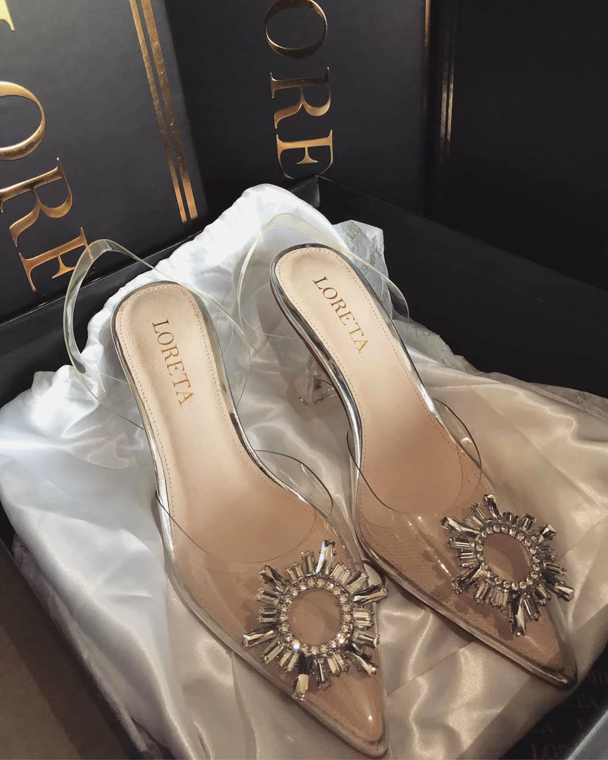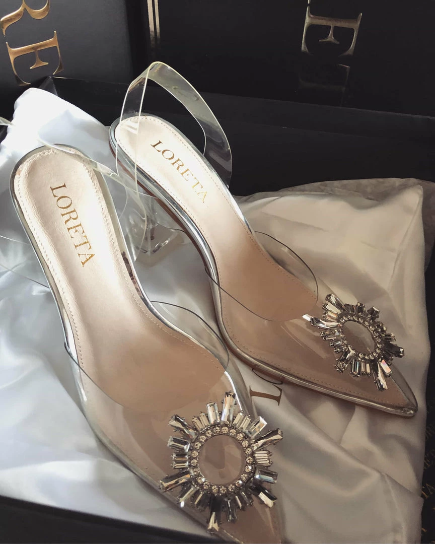 Material: Clear perspex with genuine sheepskin leather lining/sole, crystals