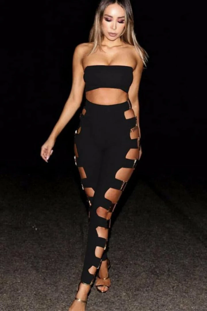 Stay on point with this sleek sexy 2-piece set that makes a huge statement. This set has a bandeau cropped top without cutout back and a slim figure-hugging bottom that features buckle details on both sides. Show off your bold side with this incredible combo.