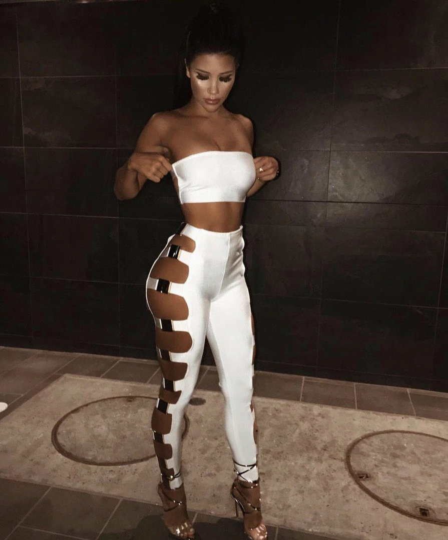 Stay on point with this sleek sexy 2-piece set that makes a huge statement. This set has a bandeau cropped top without cutout back and a slim figure-hugging bottom that features buckle details on both sides. Show off your bold side with this incredible combo.