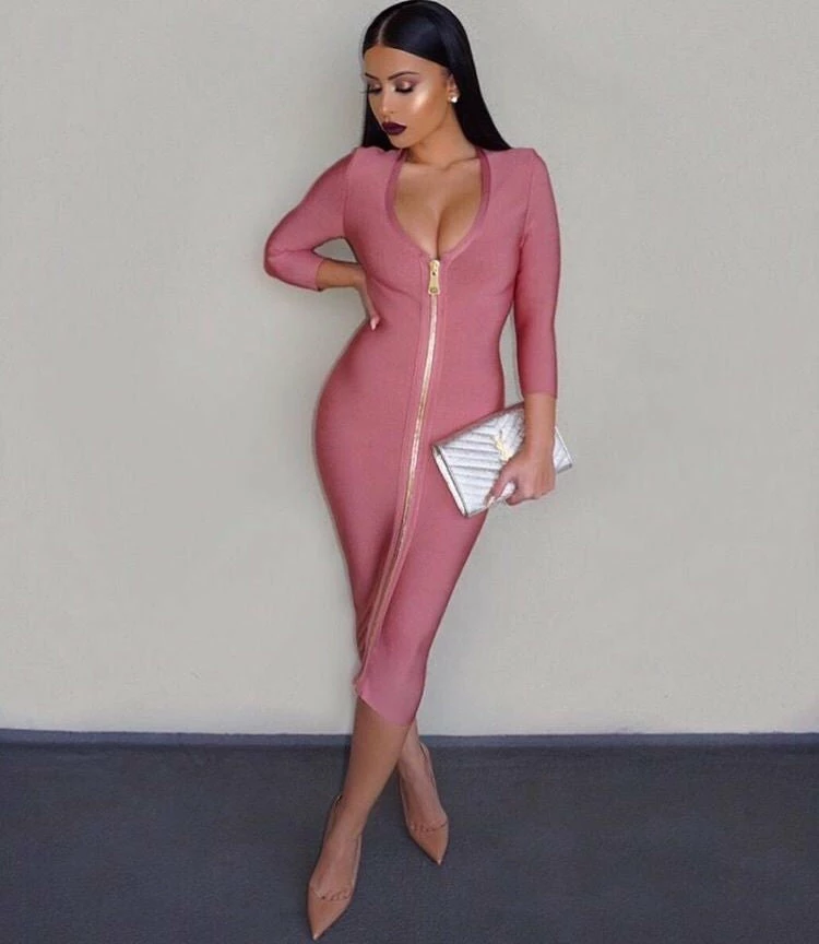 The bodycon cut draws attention to the smallest part of your frame and the low scoop neck with full length zipper lets you reveal as much or as little as you like. Set in flattering rose pink tones