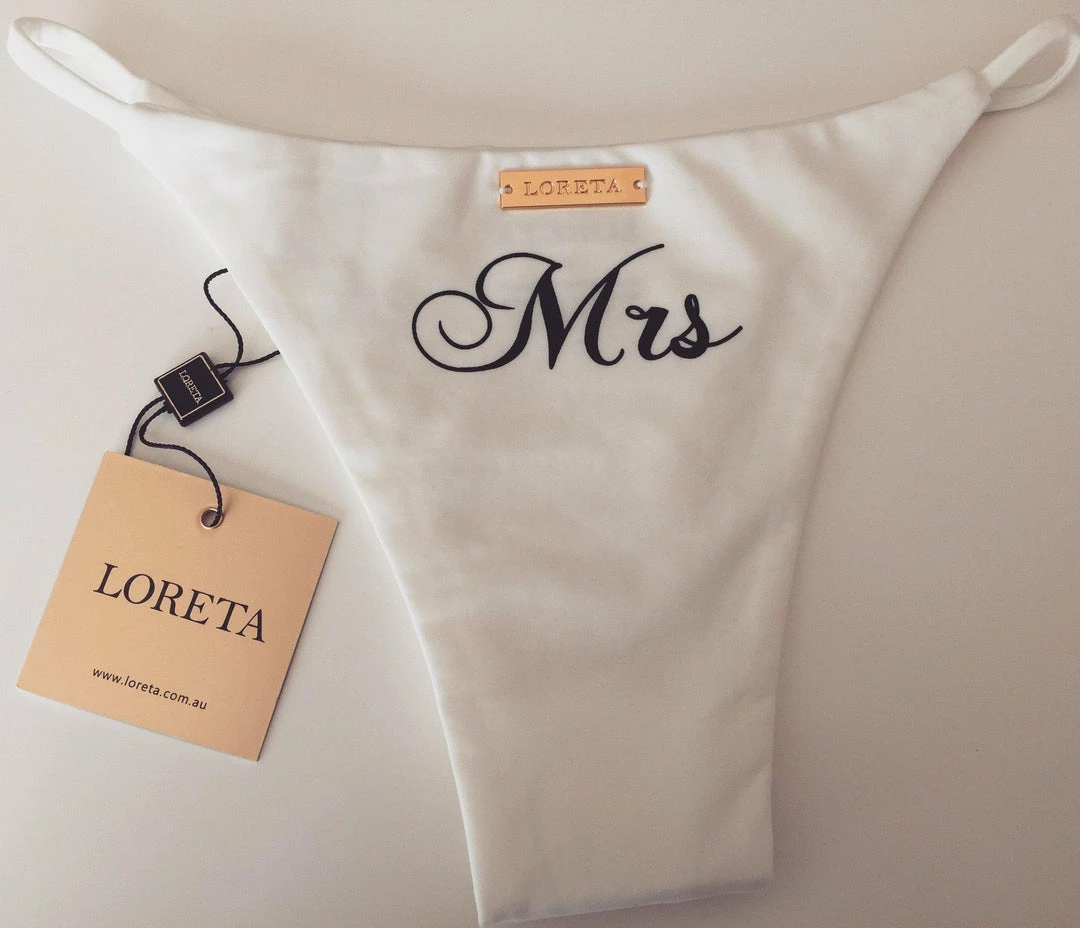 Make it official on your wedding day with this beautiful bikini bottom fit for the new Mrs. The soft fabric and elastic straps add comfort, while the beautiful lettering add a special touch for that special day.