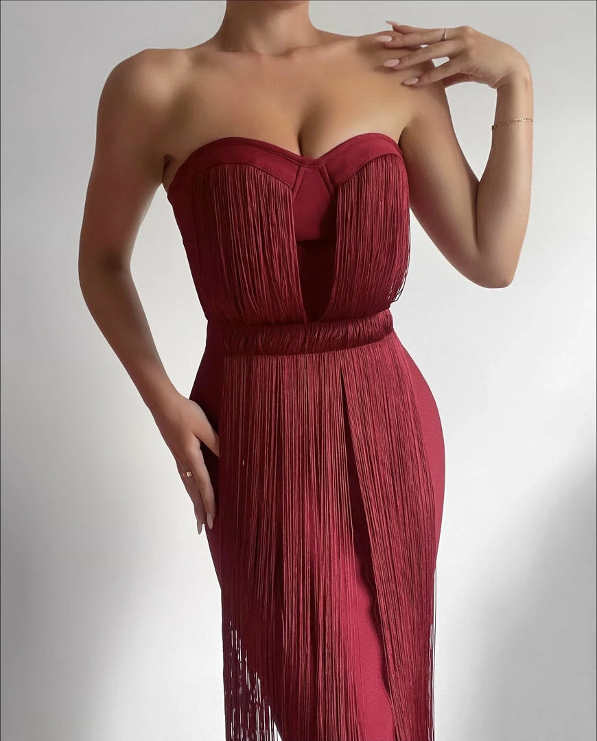 Featuring a flattering bandage material, with a Tassel/fringe details and classy midi length. Style this dress with strappy heels and a statement clutch for a look that will get you noticed.