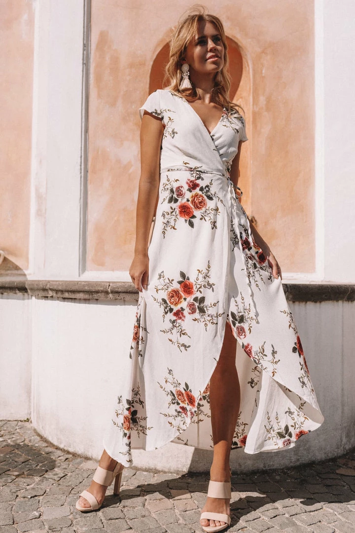 Light, airy and totally feminine, this is a beautiful floral maxi with soft cap sleeve. It features a wide flowing skirt and criss cross wrap that ties at the waist. A lovely choice for weddings, brunches or a day out to the races.