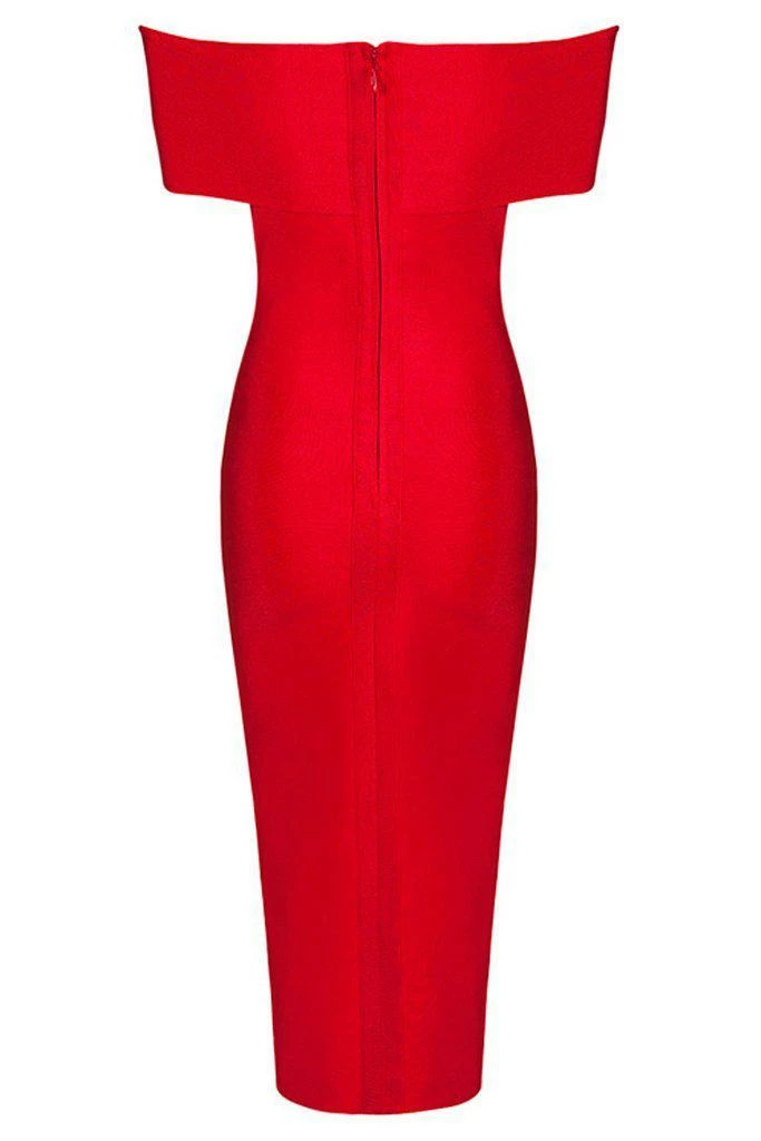 A sophisticated dress with a lovely modern twist, this is the perfect go-to dress for any occasion. The wide off-shoulder bodice balances the form-fitting design, and the cheeky side slit shows off those beautiful legs.
